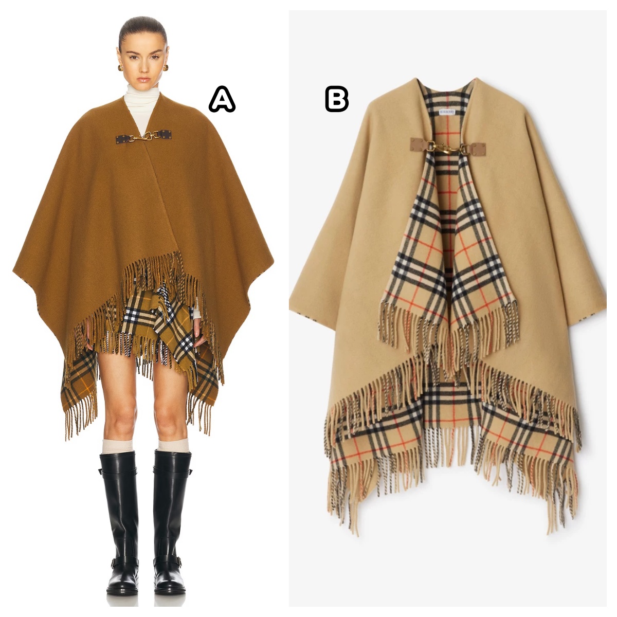 這羊絨編織鬥篷,襯有博柏利格紋,並飾有靈感源自「騎馬騎士」圖案的馬形夾扣。屬於博柏利經典百搭系列。