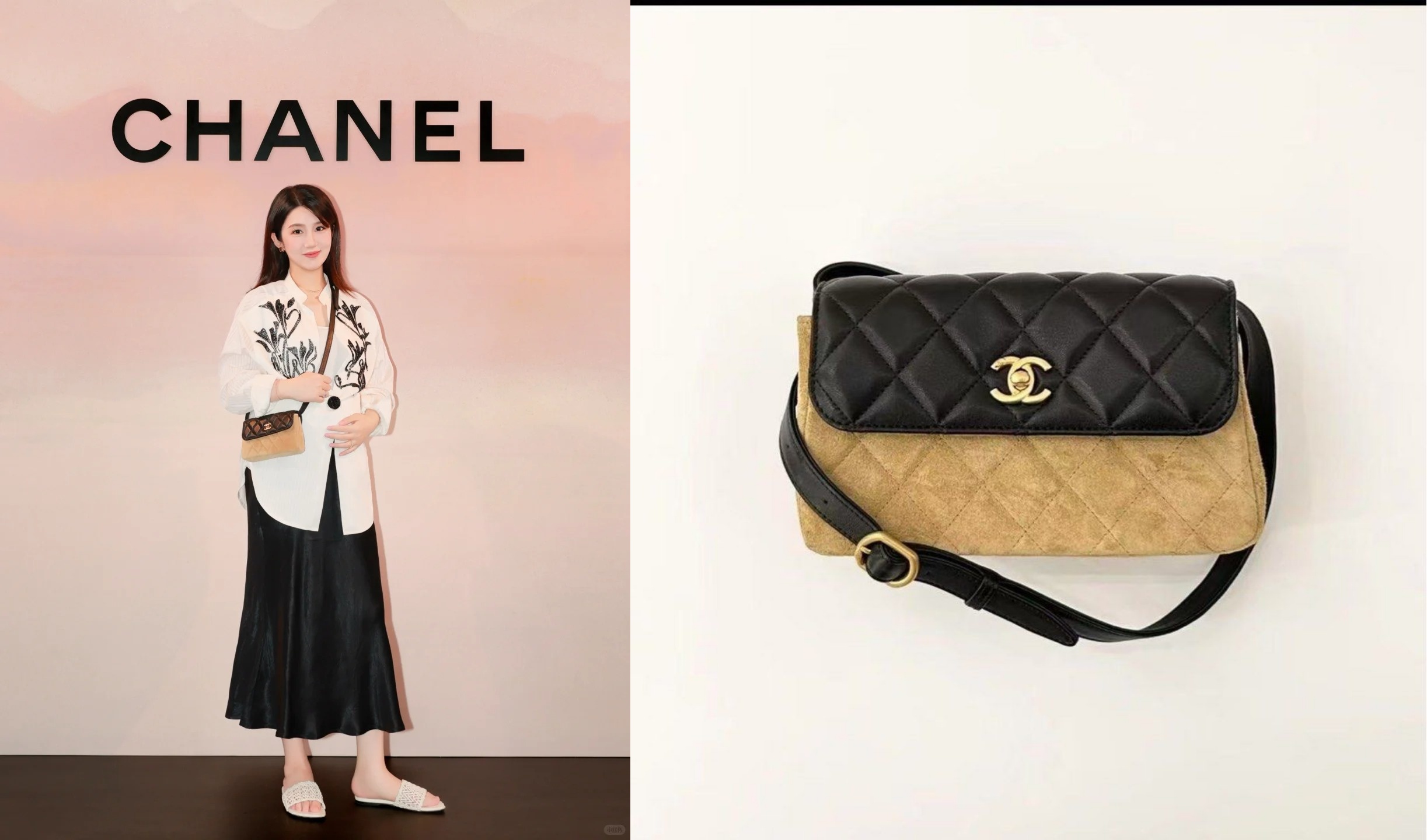 CHANEL 手工坊系列口蓋包,黑色小羊皮+棕色麂皮拼接,經典菱格紋+CC LOGO,復古優雅。19.5x11.5x5cm尺寸能裝入日常使用物品,出行或宴會搭配都合適。肩帶柔軟可調節,手拿、腋下、斜挎隨心切換,使用又時髦。