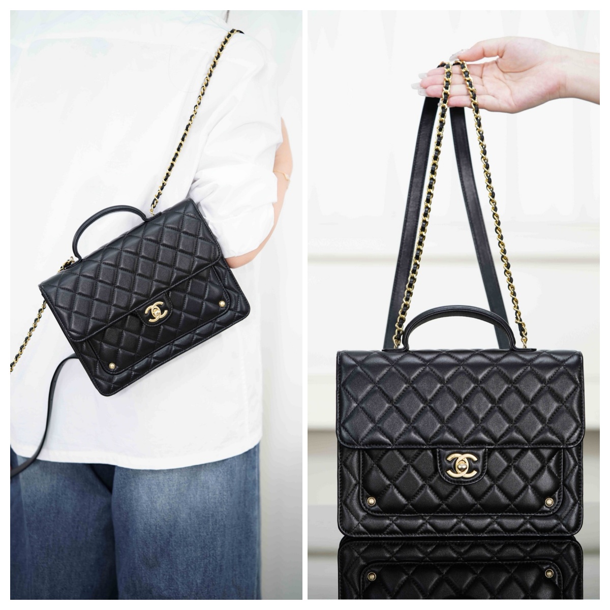 方正的廓形設計結合中古學院氛圍,搭配柔軟細膩的菱格紋小羊皮,既精緻又帶點酷颯感 。黑金配色更是完美平衡了優雅與帥氣,讓整體造型一秒提升質感 🌟