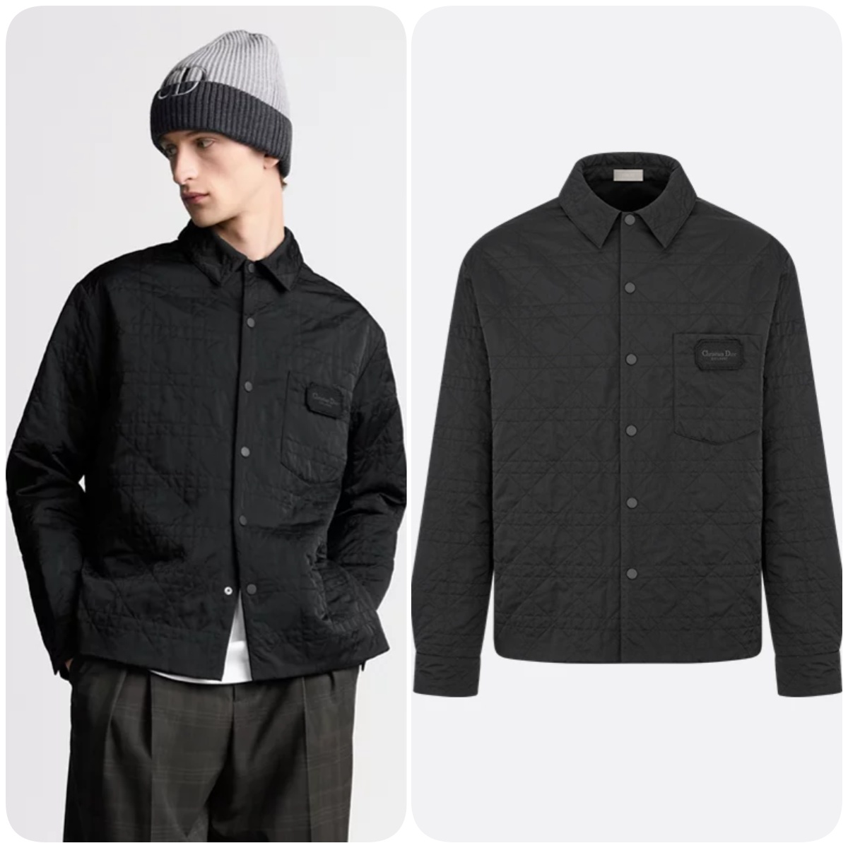採用黑色科技布料精心製作,打造時尚剪裁,全身飾以絎縫藤格紋,向經典圖案致敬。胸前貼袋飾以Christian Dior Couture 刺繡,側邊開衩設計,搭配按扣,可開放或扣上穿著。