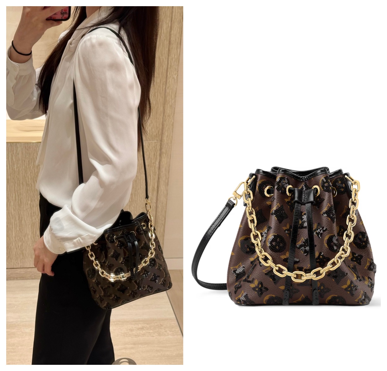 LV SKI 系列的 Noé BB 手袋閃耀奪目✨是您在滑雪小屋或都市夜晚的完美之選🌃這款手袋採用帆布材質,飾以華麗的亮片🌟並飾有路易威登標誌性的Monogram 圖案。這款對 1932 年經典設計的重新詮釋,增添了一條粗獷的金色鏈條🔗其尺寸適中,可輕鬆收納您的必備小物💄無論是上班👩💼約會💖出遊🚶♀️都非常合適💯